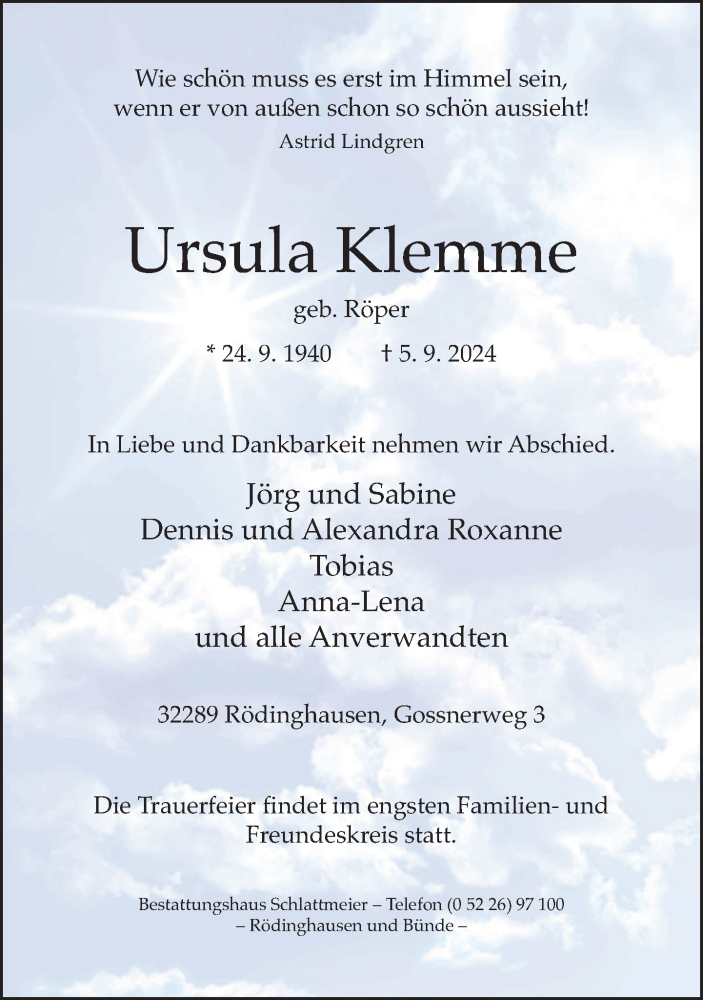 Hier finden Sie alle Traueranzeigen aus der Zeitung, die bisher für Ursula Klemme erschienen sind. Weitere Traueranzeigen, die in der Zeitung erscheinen, werden hier ebenfalls aufgelistet
