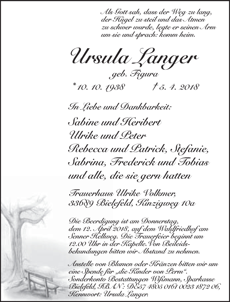 Hier finden Sie alle Traueranzeigen aus der Zeitung, die bisher für Ursula Langer erschienen sind. Weitere Traueranzeigen, die in der Zeitung erscheinen, werden hier ebenfalls aufgelistet