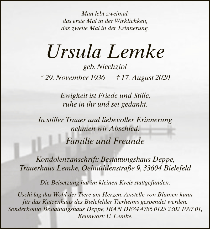 Hier finden Sie alle Traueranzeigen aus der Zeitung, die bisher für Ursula Lemke erschienen sind. Weitere Traueranzeigen, die in der Zeitung erscheinen, werden hier ebenfalls aufgelistet