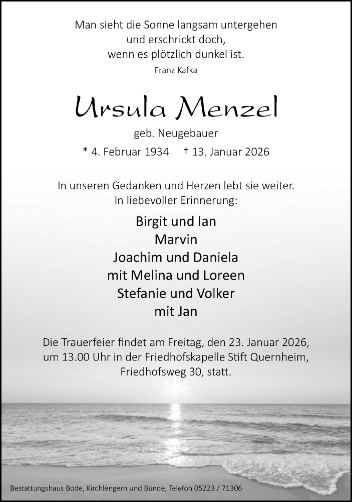 Hier finden Sie alle Traueranzeigen aus der Zeitung, die bisher für Ursula Menzel erschienen sind. Weitere Traueranzeigen, die in der Zeitung erscheinen, werden hier ebenfalls aufgelistet