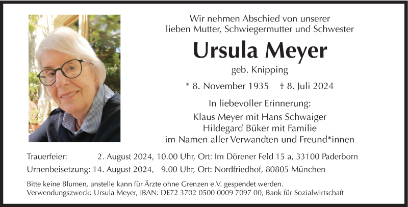 Hier finden Sie alle Traueranzeigen aus der Zeitung, die bisher für Ursula Meyer erschienen sind. Weitere Traueranzeigen, die in der Zeitung erscheinen, werden hier ebenfalls aufgelistet
