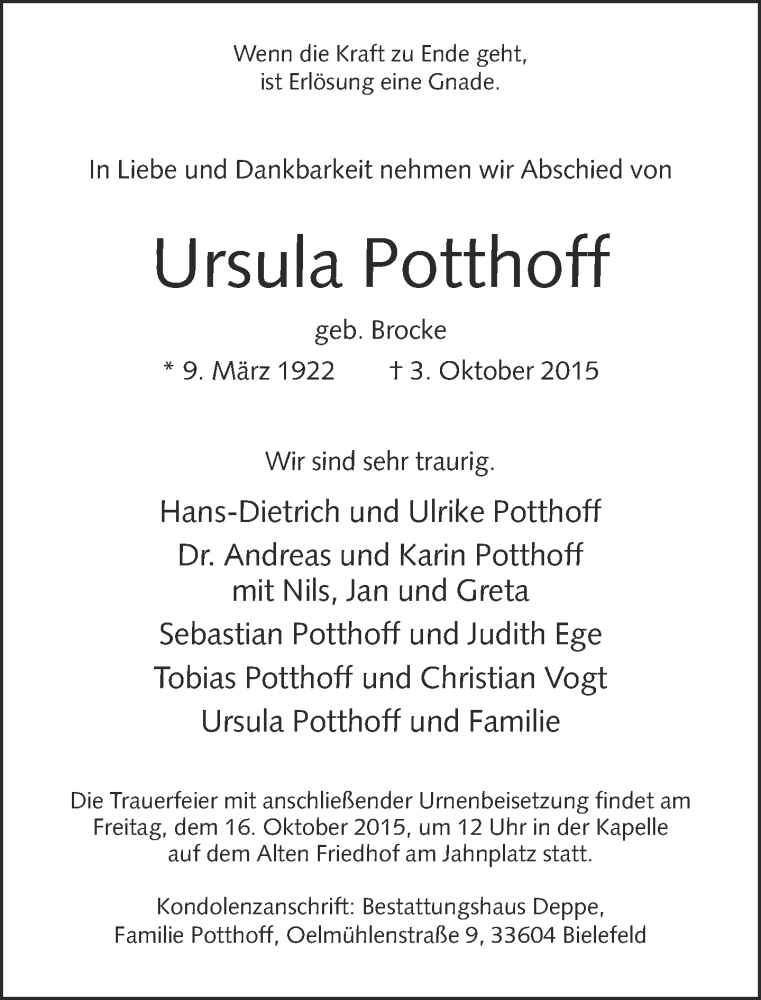 Hier finden Sie alle Traueranzeigen aus der Zeitung, die bisher für Ursula Potthoff erschienen sind. Weitere Traueranzeigen, die in der Zeitung erscheinen, werden hier ebenfalls aufgelistet