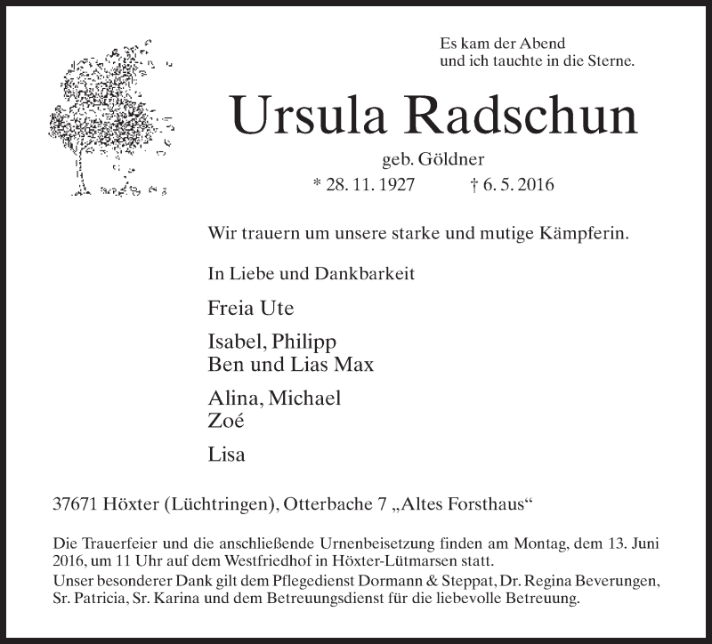 Hier finden Sie alle Traueranzeigen aus der Zeitung, die bisher für Ursula Radschun erschienen sind. Weitere Traueranzeigen, die in der Zeitung erscheinen, werden hier ebenfalls aufgelistet