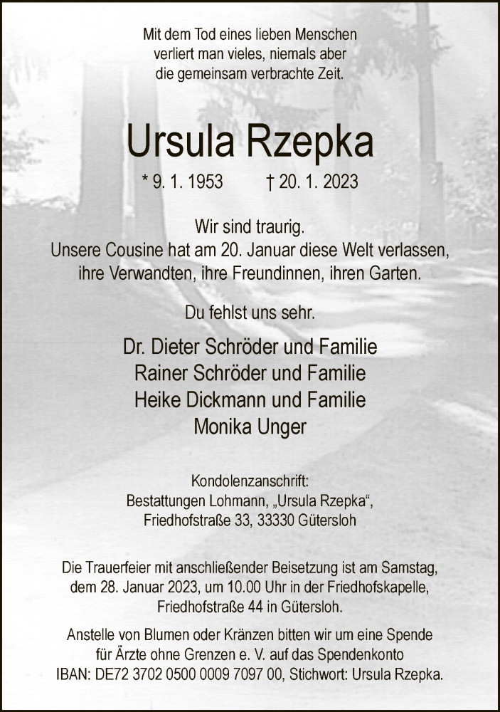 Hier finden Sie alle Traueranzeigen aus der Zeitung, die bisher für Ursula Rzepka erschienen sind. Weitere Traueranzeigen, die in der Zeitung erscheinen, werden hier ebenfalls aufgelistet
