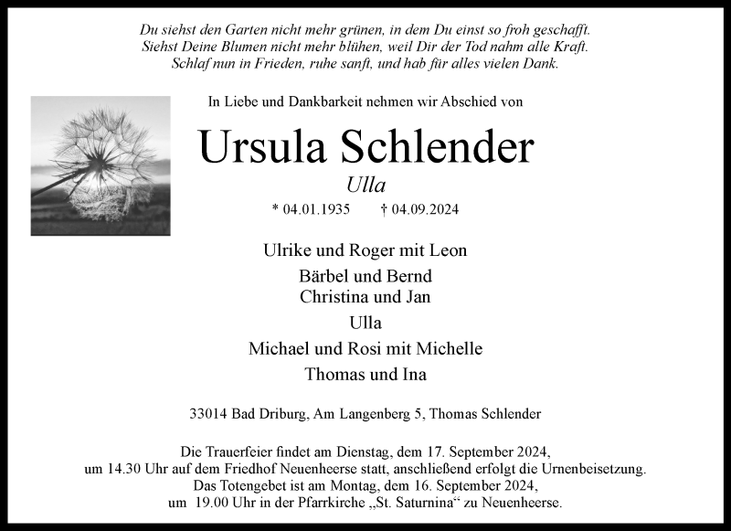 Hier finden Sie alle Traueranzeigen aus der Zeitung, die bisher für Ursula Schlender erschienen sind. Weitere Traueranzeigen, die in der Zeitung erscheinen, werden hier ebenfalls aufgelistet