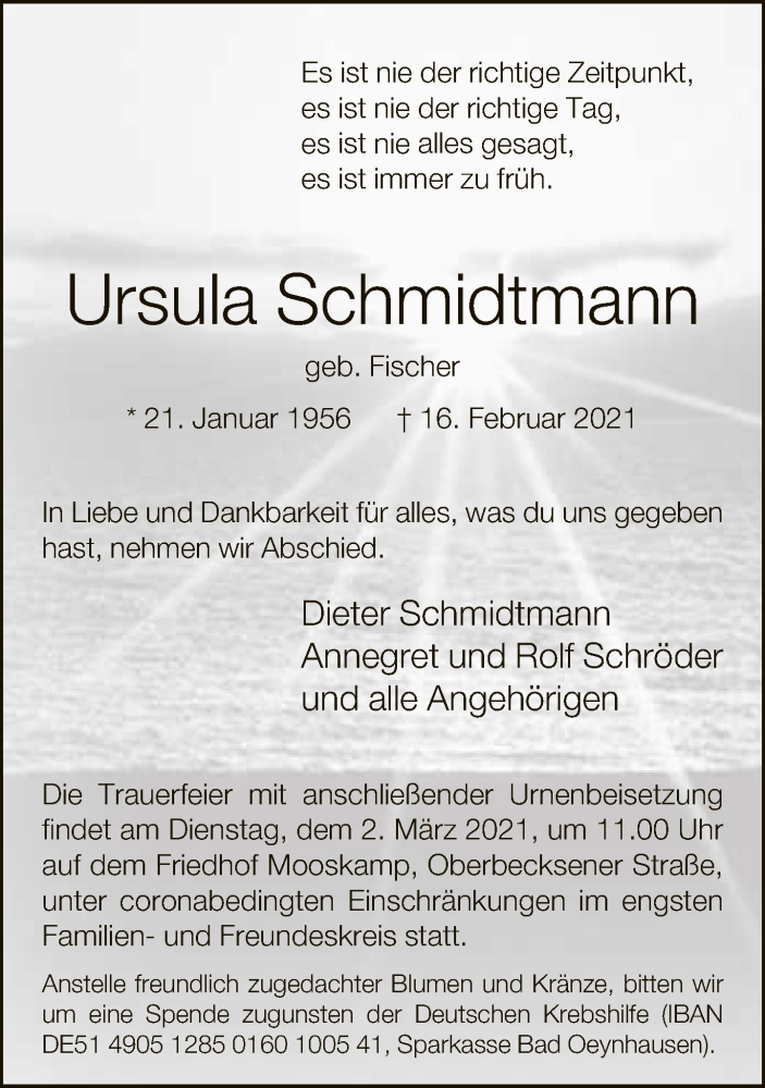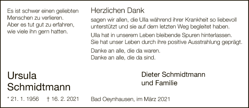 Hier finden Sie alle Traueranzeigen aus der Zeitung, die bisher für Ursula Schmidtmann erschienen sind. Weitere Traueranzeigen, die in der Zeitung erscheinen, werden hier ebenfalls aufgelistet