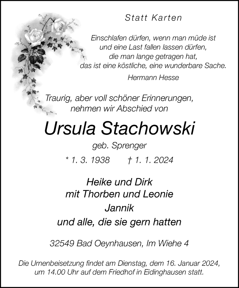 Hier finden Sie alle Traueranzeigen aus der Zeitung, die bisher für Ursula Stachowski erschienen sind. Weitere Traueranzeigen, die in der Zeitung erscheinen, werden hier ebenfalls aufgelistet