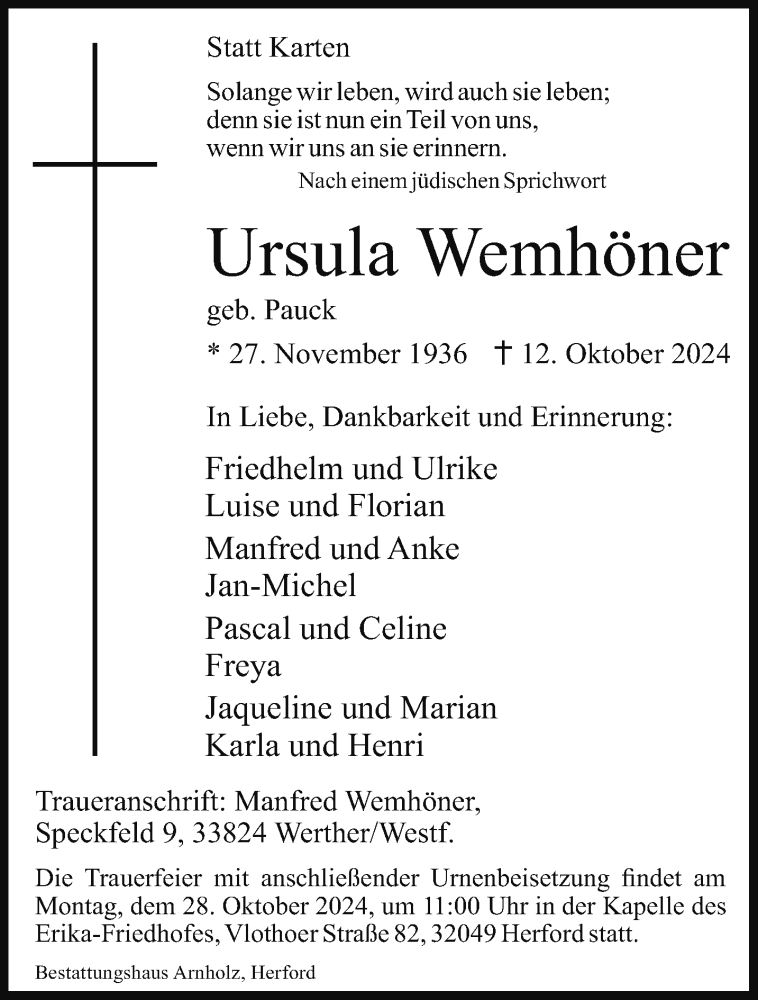 Hier finden Sie alle Traueranzeigen aus der Zeitung, die bisher für Ursula Wemhöner erschienen sind. Weitere Traueranzeigen, die in der Zeitung erscheinen, werden hier ebenfalls aufgelistet