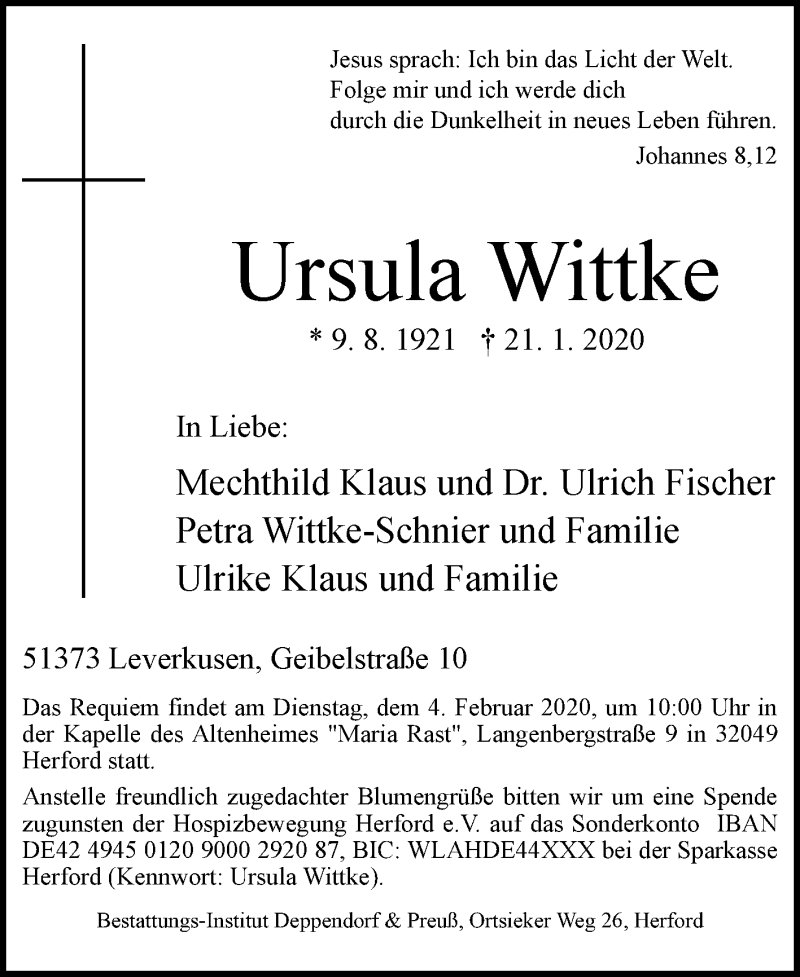 Hier finden Sie alle Traueranzeigen aus der Zeitung, die bisher für Ursula Wittke erschienen sind. Weitere Traueranzeigen, die in der Zeitung erscheinen, werden hier ebenfalls aufgelistet