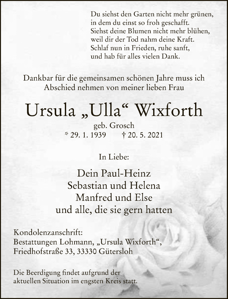 Hier finden Sie alle Traueranzeigen aus der Zeitung, die bisher für Ursula Wixforth erschienen sind. Weitere Traueranzeigen, die in der Zeitung erscheinen, werden hier ebenfalls aufgelistet
