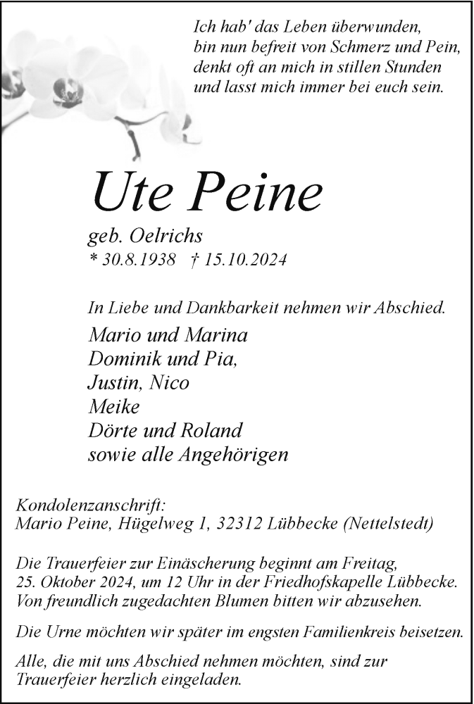 Hier finden Sie alle Traueranzeigen aus der Zeitung, die bisher für Ute Peine erschienen sind. Weitere Traueranzeigen, die in der Zeitung erscheinen, werden hier ebenfalls aufgelistet