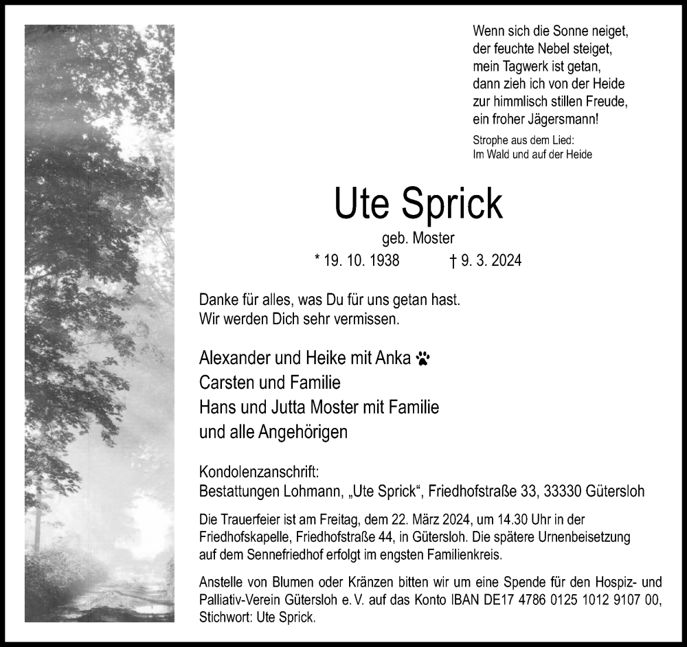 Hier finden Sie alle Traueranzeigen aus der Zeitung, die bisher für Ute Sprick erschienen sind. Weitere Traueranzeigen, die in der Zeitung erscheinen, werden hier ebenfalls aufgelistet