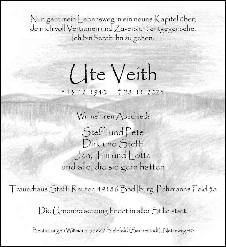 Hier finden Sie alle Traueranzeigen aus der Zeitung, die bisher für Ute Veith erschienen sind. Weitere Traueranzeigen, die in der Zeitung erscheinen, werden hier ebenfalls aufgelistet