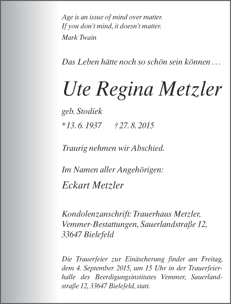 Hier finden Sie alle Traueranzeigen aus der Zeitung, die bisher für Ute Regina Metzler erschienen sind. Weitere Traueranzeigen, die in der Zeitung erscheinen, werden hier ebenfalls aufgelistet