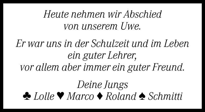 Hier finden Sie alle Traueranzeigen aus der Zeitung, die bisher für Uwe - erschienen sind. Weitere Traueranzeigen, die in der Zeitung erscheinen, werden hier ebenfalls aufgelistet