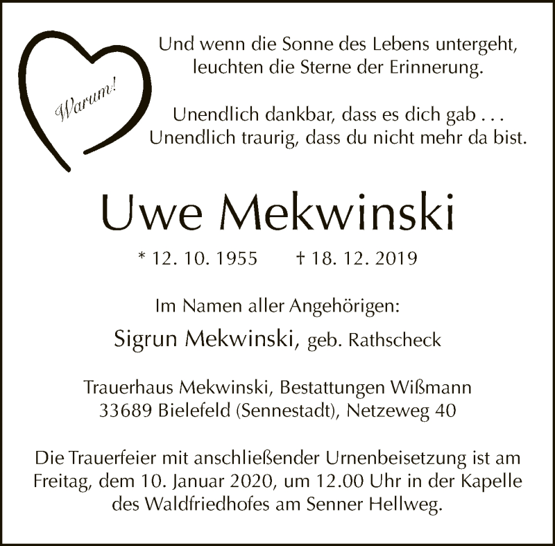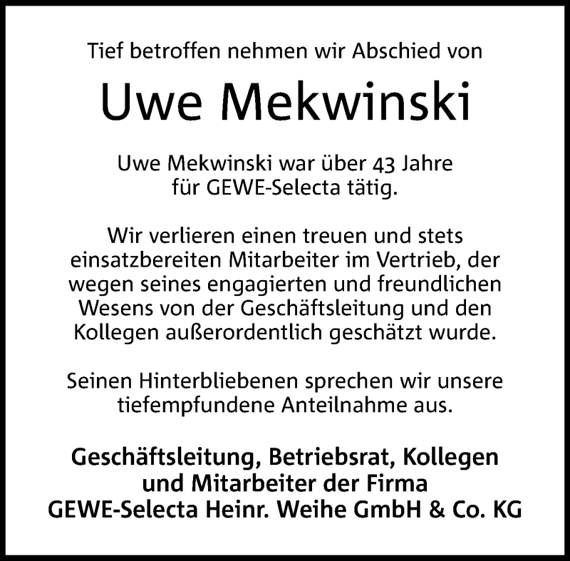 Hier finden Sie alle Traueranzeigen aus der Zeitung, die bisher für Uwe Mekwinski erschienen sind. Weitere Traueranzeigen, die in der Zeitung erscheinen, werden hier ebenfalls aufgelistet