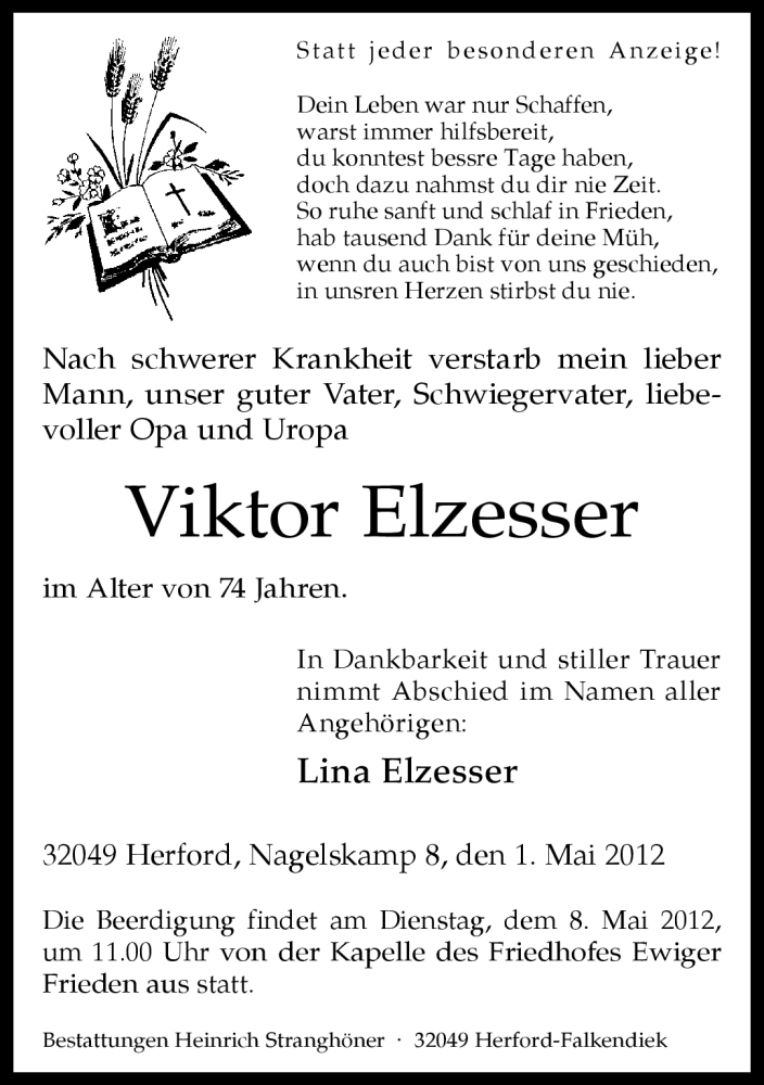 Hier finden Sie alle Traueranzeigen aus der Zeitung, die bisher für Viktor Elzesser erschienen sind. Weitere Traueranzeigen, die in der Zeitung erscheinen, werden hier ebenfalls aufgelistet