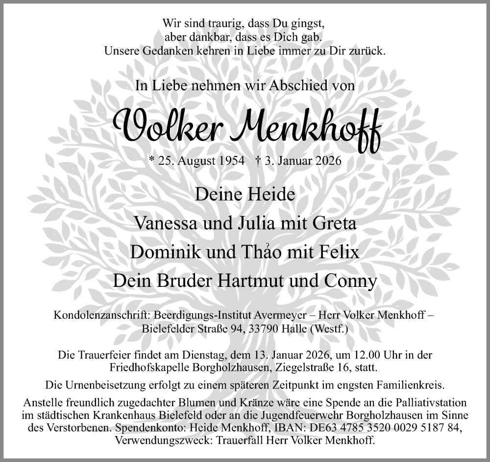 Hier finden Sie alle Traueranzeigen aus der Zeitung, die bisher für Volker Menkhoff erschienen sind. Weitere Traueranzeigen, die in der Zeitung erscheinen, werden hier ebenfalls aufgelistet