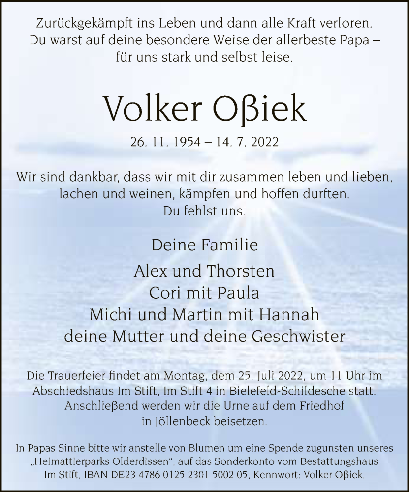Hier finden Sie alle Traueranzeigen aus der Zeitung, die bisher für Volker Oßiek erschienen sind. Weitere Traueranzeigen, die in der Zeitung erscheinen, werden hier ebenfalls aufgelistet