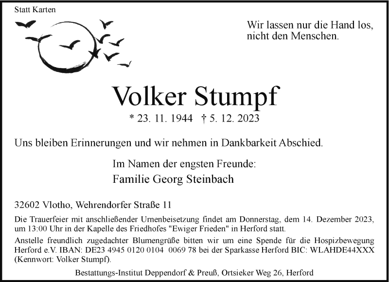 Hier finden Sie alle Traueranzeigen aus der Zeitung, die bisher für Volker Stumpf erschienen sind. Weitere Traueranzeigen, die in der Zeitung erscheinen, werden hier ebenfalls aufgelistet