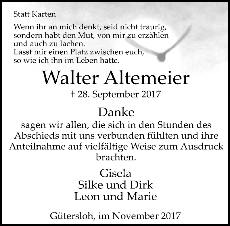 Hier finden Sie alle Traueranzeigen aus der Zeitung, die bisher für Walter Altemeier erschienen sind. Weitere Traueranzeigen, die in der Zeitung erscheinen, werden hier ebenfalls aufgelistet