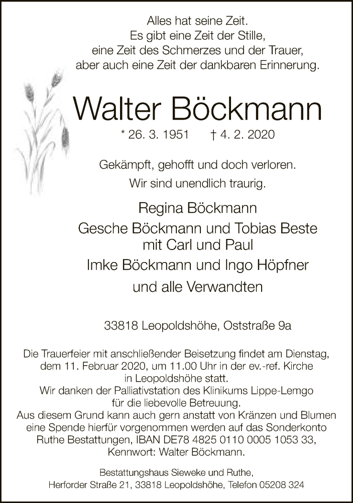 Hier finden Sie alle Traueranzeigen aus der Zeitung, die bisher für Walter Böckmann erschienen sind. Weitere Traueranzeigen, die in der Zeitung erscheinen, werden hier ebenfalls aufgelistet