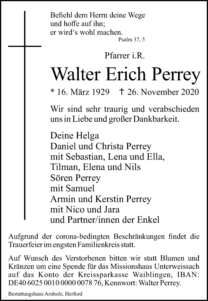 Hier finden Sie alle Traueranzeigen aus der Zeitung, die bisher für Walter Erich Perrey erschienen sind. Weitere Traueranzeigen, die in der Zeitung erscheinen, werden hier ebenfalls aufgelistet