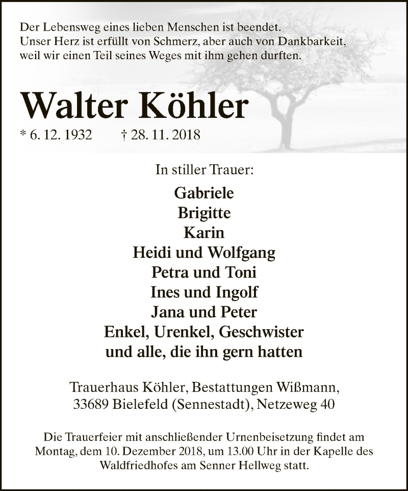 Hier finden Sie alle Traueranzeigen aus der Zeitung, die bisher für Walter Köhler erschienen sind. Weitere Traueranzeigen, die in der Zeitung erscheinen, werden hier ebenfalls aufgelistet