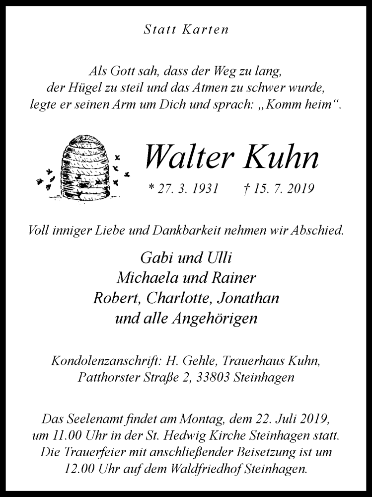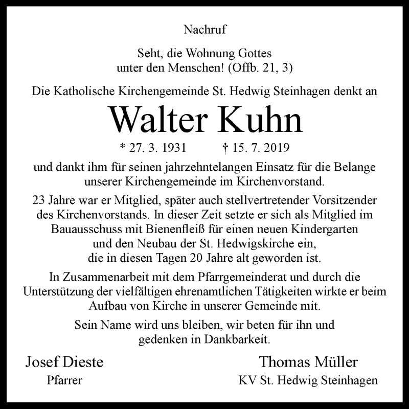 Hier finden Sie alle Traueranzeigen aus der Zeitung, die bisher für Walter Kuhn erschienen sind. Weitere Traueranzeigen, die in der Zeitung erscheinen, werden hier ebenfalls aufgelistet