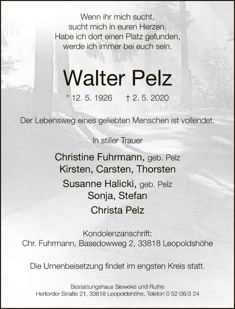 Hier finden Sie alle Traueranzeigen aus der Zeitung, die bisher für Walter Pelz erschienen sind. Weitere Traueranzeigen, die in der Zeitung erscheinen, werden hier ebenfalls aufgelistet