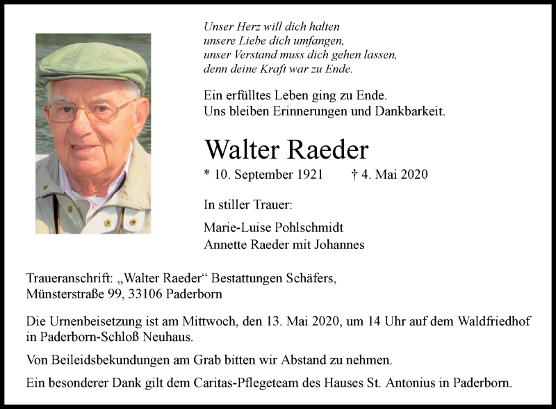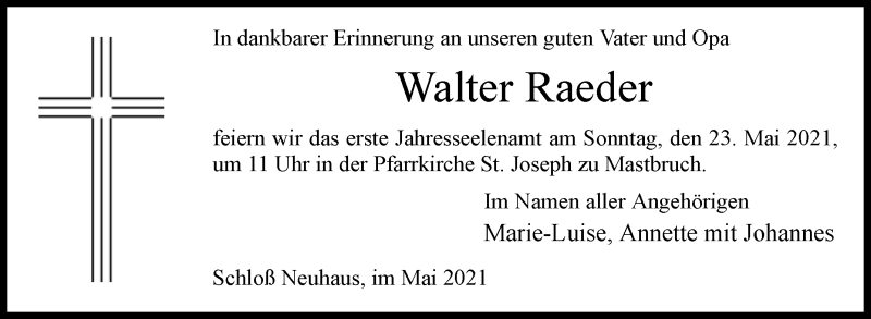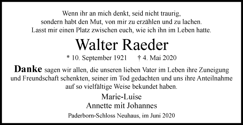 Hier finden Sie alle Traueranzeigen aus der Zeitung, die bisher für Walter Raeder erschienen sind. Weitere Traueranzeigen, die in der Zeitung erscheinen, werden hier ebenfalls aufgelistet