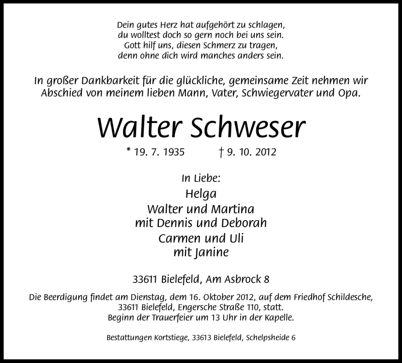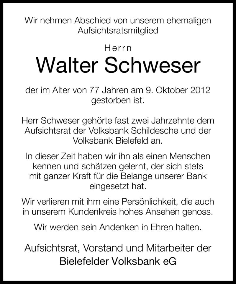 Hier finden Sie alle Traueranzeigen aus der Zeitung, die bisher für Walter Schweser erschienen sind. Weitere Traueranzeigen, die in der Zeitung erscheinen, werden hier ebenfalls aufgelistet