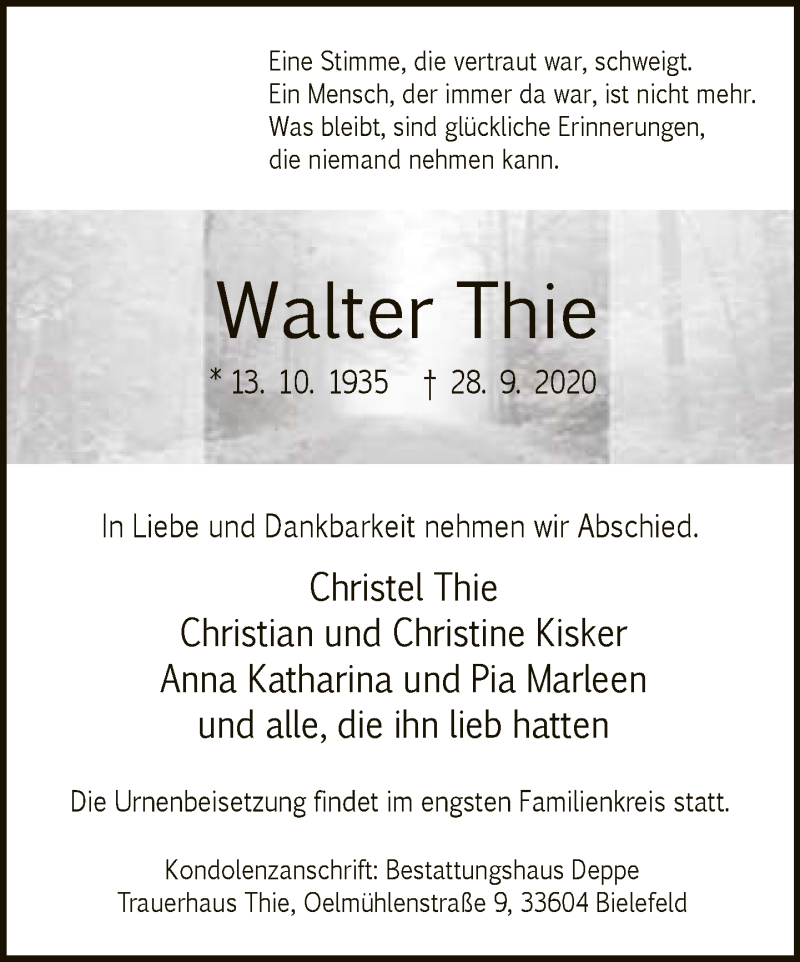 Hier finden Sie alle Traueranzeigen aus der Zeitung, die bisher für Walter Thie erschienen sind. Weitere Traueranzeigen, die in der Zeitung erscheinen, werden hier ebenfalls aufgelistet