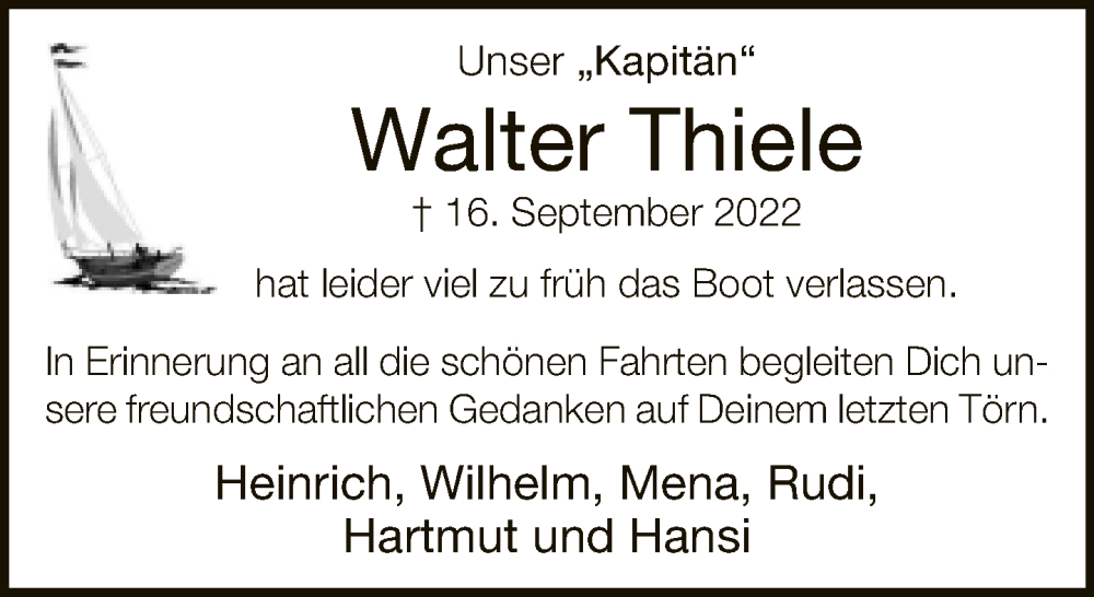 Hier finden Sie alle Traueranzeigen aus der Zeitung, die bisher für Walter Thiele erschienen sind. Weitere Traueranzeigen, die in der Zeitung erscheinen, werden hier ebenfalls aufgelistet