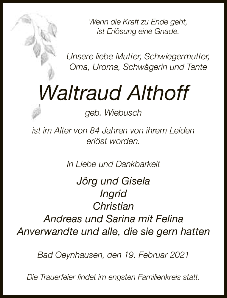 Hier finden Sie alle Traueranzeigen aus der Zeitung, die bisher für Waltraud Althoff erschienen sind. Weitere Traueranzeigen, die in der Zeitung erscheinen, werden hier ebenfalls aufgelistet