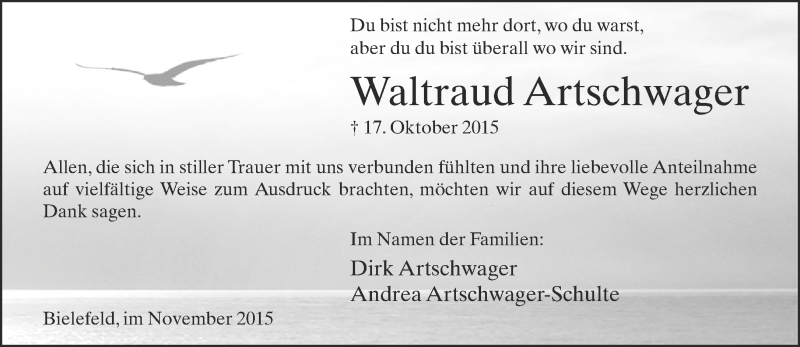 Hier finden Sie alle Traueranzeigen aus der Zeitung, die bisher für Waltraud Artschwager erschienen sind. Weitere Traueranzeigen, die in der Zeitung erscheinen, werden hier ebenfalls aufgelistet