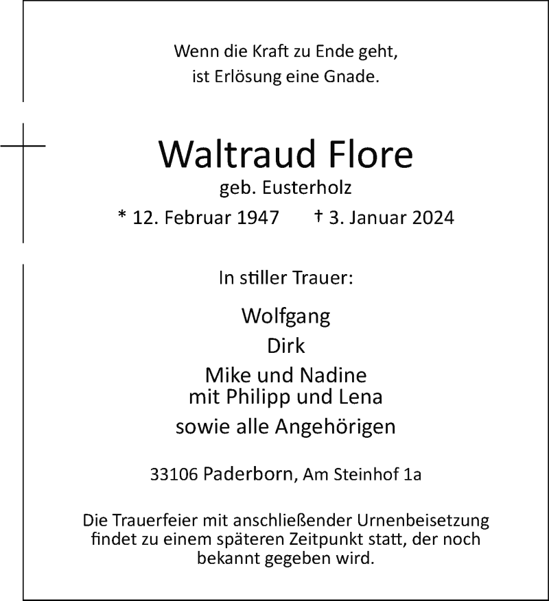 Hier finden Sie alle Traueranzeigen aus der Zeitung, die bisher für Waltraud Flore erschienen sind. Weitere Traueranzeigen, die in der Zeitung erscheinen, werden hier ebenfalls aufgelistet