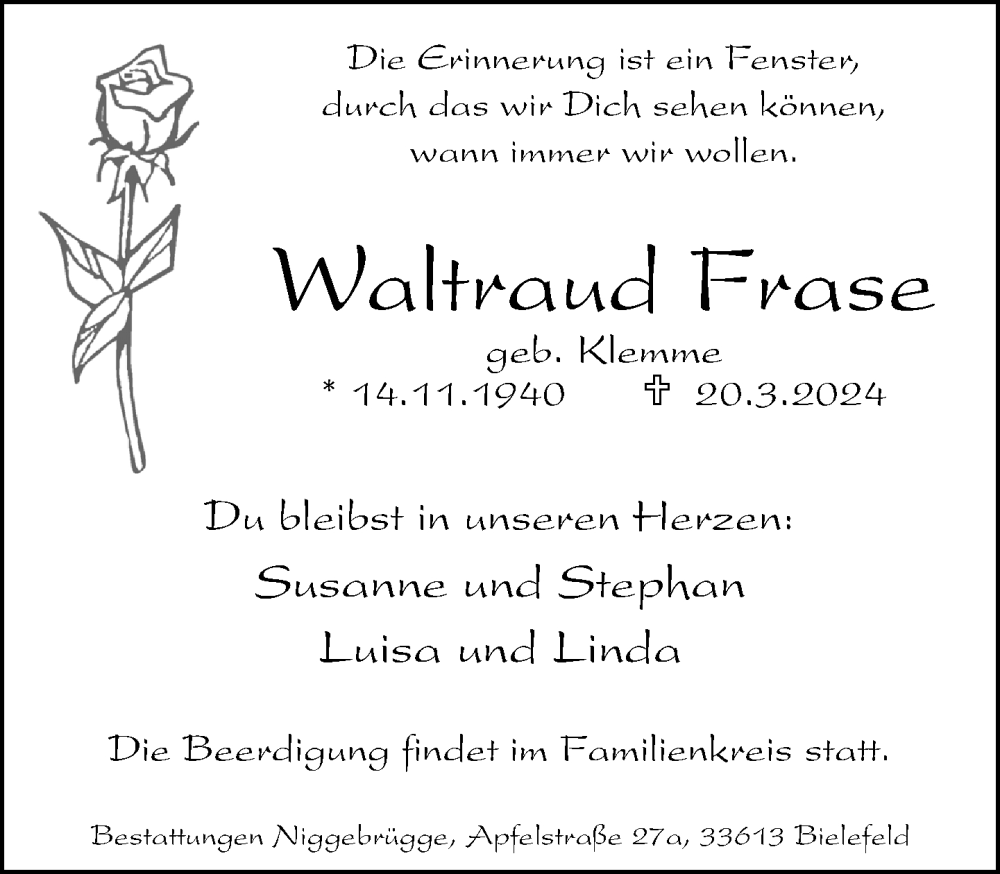 Hier finden Sie alle Traueranzeigen aus der Zeitung, die bisher für Waltraud Frase erschienen sind. Weitere Traueranzeigen, die in der Zeitung erscheinen, werden hier ebenfalls aufgelistet