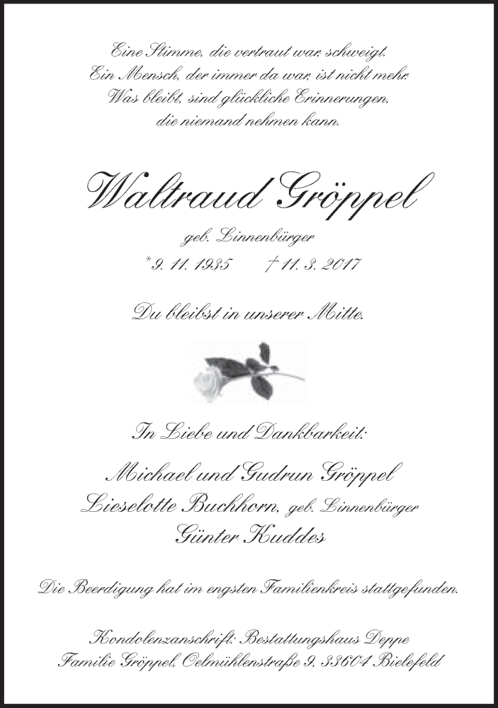 Hier finden Sie alle Traueranzeigen aus der Zeitung, die bisher für Waltraud Gröppel erschienen sind. Weitere Traueranzeigen, die in der Zeitung erscheinen, werden hier ebenfalls aufgelistet