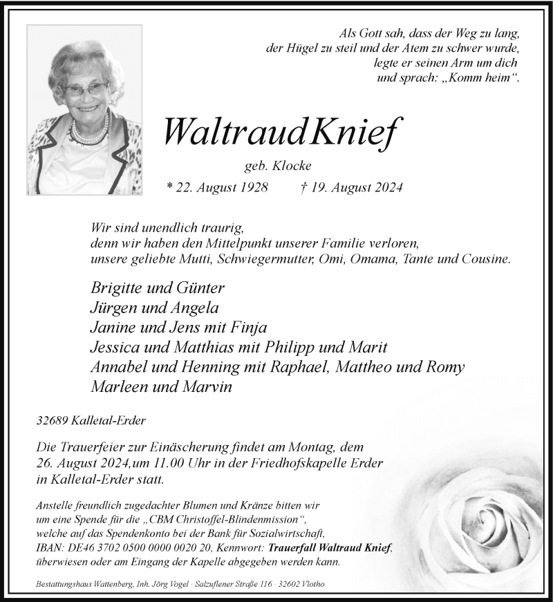 Hier finden Sie alle Traueranzeigen aus der Zeitung, die bisher für Waltraud Knief erschienen sind. Weitere Traueranzeigen, die in der Zeitung erscheinen, werden hier ebenfalls aufgelistet
