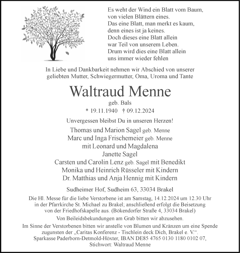 Hier finden Sie alle Traueranzeigen aus der Zeitung, die bisher für Waltraud Menne erschienen sind. Weitere Traueranzeigen, die in der Zeitung erscheinen, werden hier ebenfalls aufgelistet