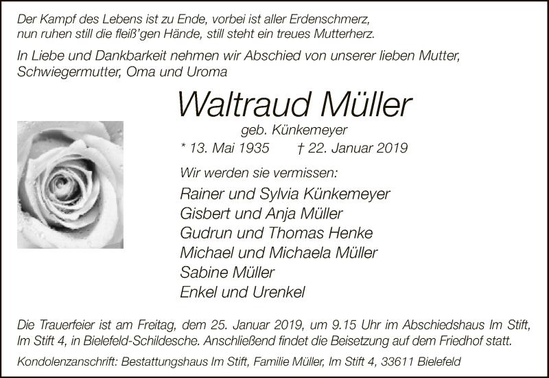 Hier finden Sie alle Traueranzeigen aus der Zeitung, die bisher für Waltraud Müller erschienen sind. Weitere Traueranzeigen, die in der Zeitung erscheinen, werden hier ebenfalls aufgelistet