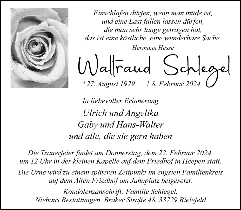 Hier finden Sie alle Traueranzeigen aus der Zeitung, die bisher für Waltraud Schlegel erschienen sind. Weitere Traueranzeigen, die in der Zeitung erscheinen, werden hier ebenfalls aufgelistet
