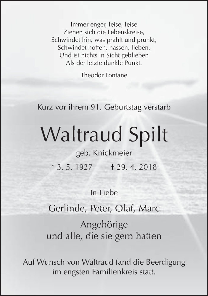 Hier finden Sie alle Traueranzeigen aus der Zeitung, die bisher für Waltraud Spilt erschienen sind. Weitere Traueranzeigen, die in der Zeitung erscheinen, werden hier ebenfalls aufgelistet