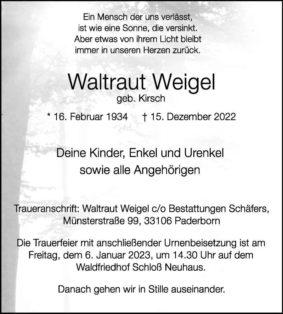 Hier finden Sie alle Traueranzeigen aus der Zeitung, die bisher für Waltraud Weigel erschienen sind. Weitere Traueranzeigen, die in der Zeitung erscheinen, werden hier ebenfalls aufgelistet