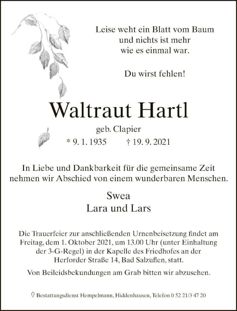 Hier finden Sie alle Traueranzeigen aus der Zeitung, die bisher für Waltraut Hartl erschienen sind. Weitere Traueranzeigen, die in der Zeitung erscheinen, werden hier ebenfalls aufgelistet