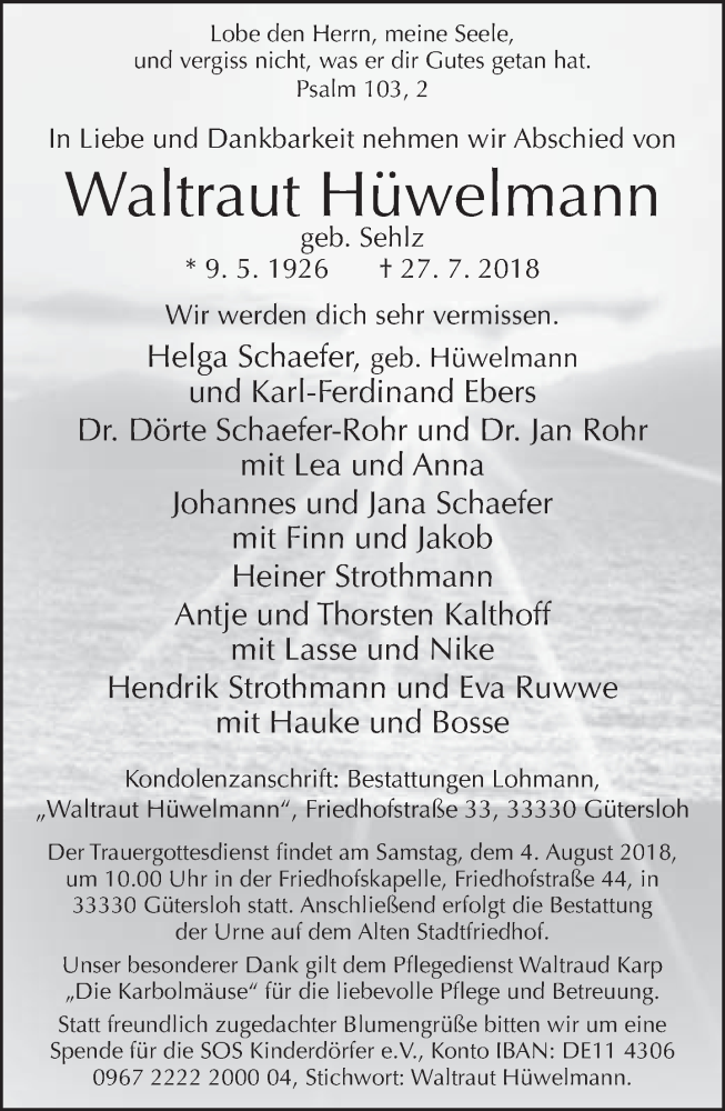 Hier finden Sie alle Traueranzeigen aus der Zeitung, die bisher für Waltraut Hüwelmann erschienen sind. Weitere Traueranzeigen, die in der Zeitung erscheinen, werden hier ebenfalls aufgelistet