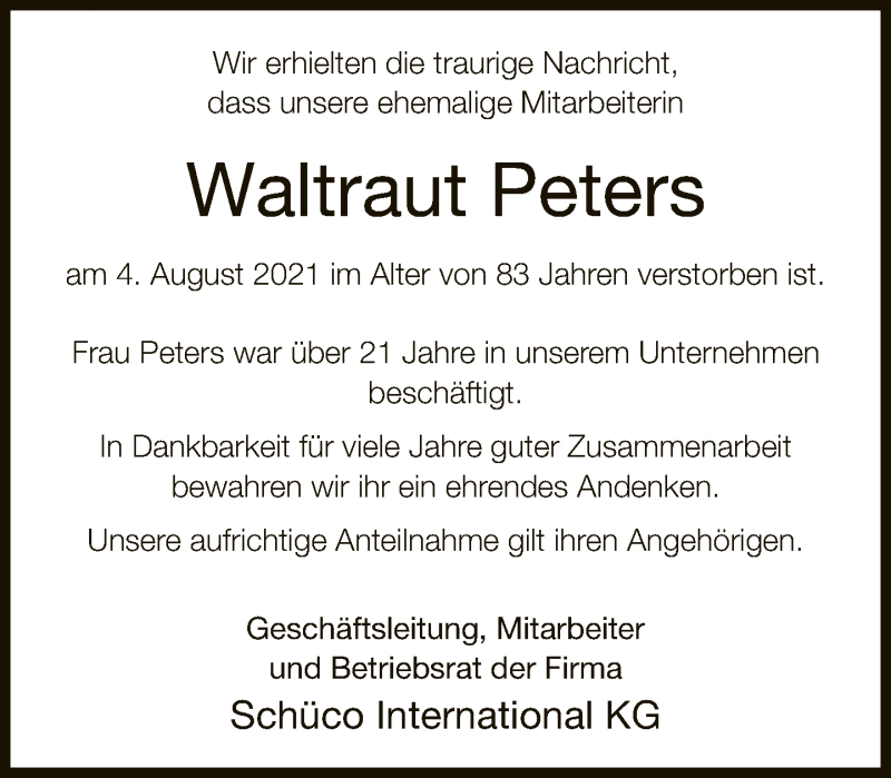 Hier finden Sie alle Traueranzeigen aus der Zeitung, die bisher für Waltraut Peters erschienen sind. Weitere Traueranzeigen, die in der Zeitung erscheinen, werden hier ebenfalls aufgelistet