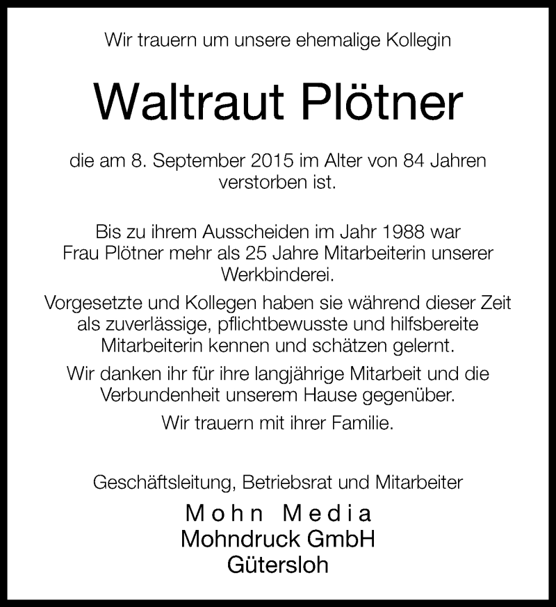 Hier finden Sie alle Traueranzeigen aus der Zeitung, die bisher für Waltraut Plötner erschienen sind. Weitere Traueranzeigen, die in der Zeitung erscheinen, werden hier ebenfalls aufgelistet