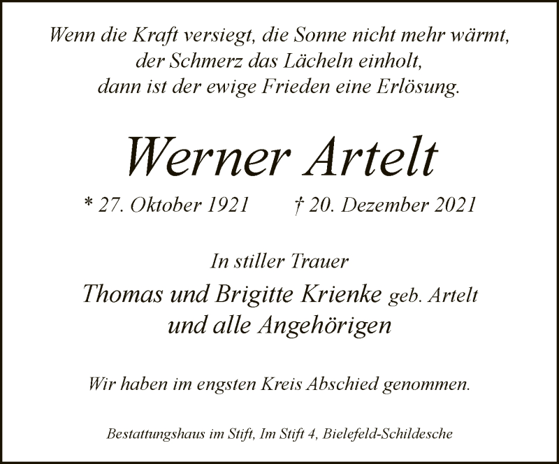 Hier finden Sie alle Traueranzeigen aus der Zeitung, die bisher für Werner Artelt erschienen sind. Weitere Traueranzeigen, die in der Zeitung erscheinen, werden hier ebenfalls aufgelistet